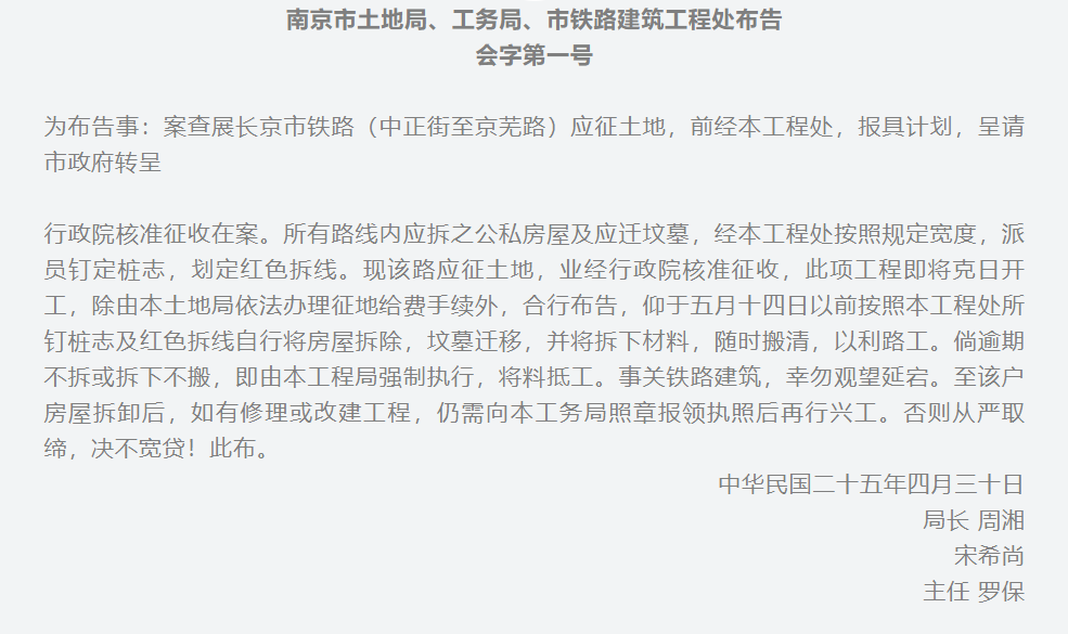 和今天的南京地铁1号线相类似,民国时期的“小火车”也有“南延线”,一张70多年以前的拆迁布告,见证了“南延线”开工建设的历史,现照录于后: