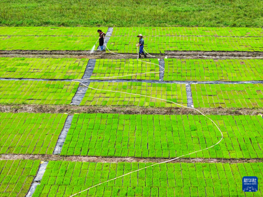 2026年4月9日,湖南省常宁市胜桥镇农民在管护秧苗(无人机照片)。